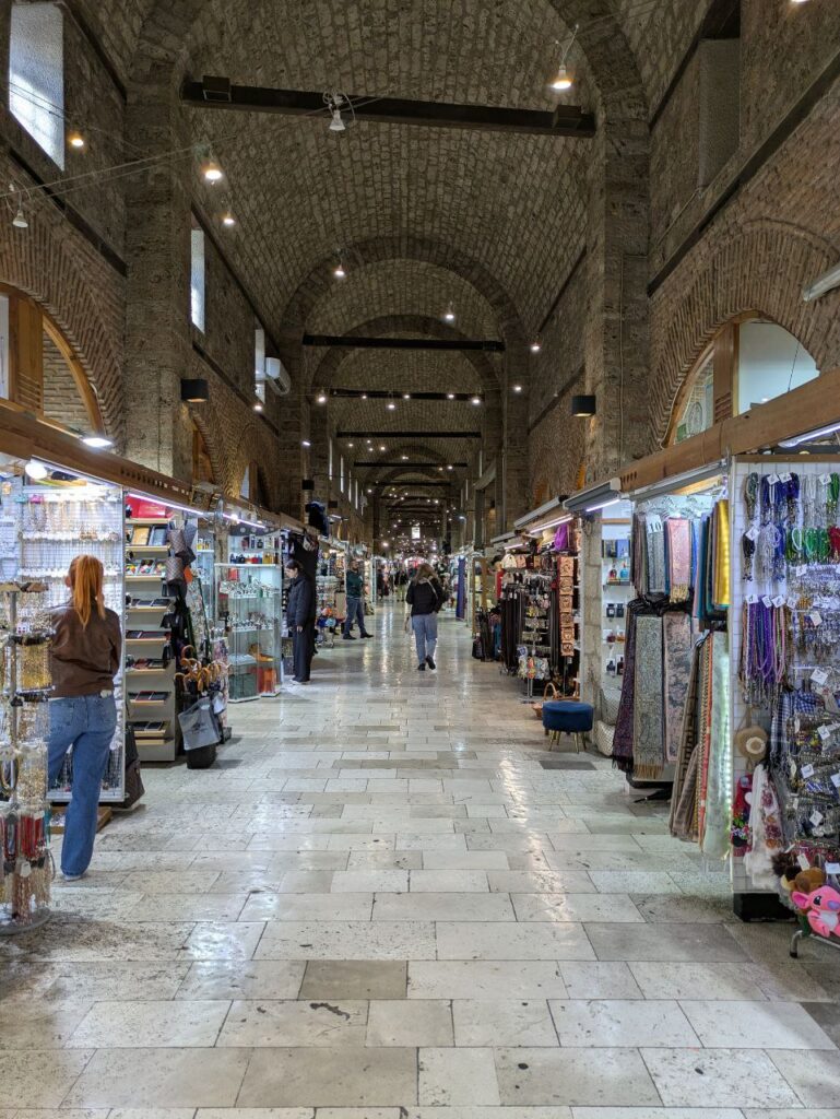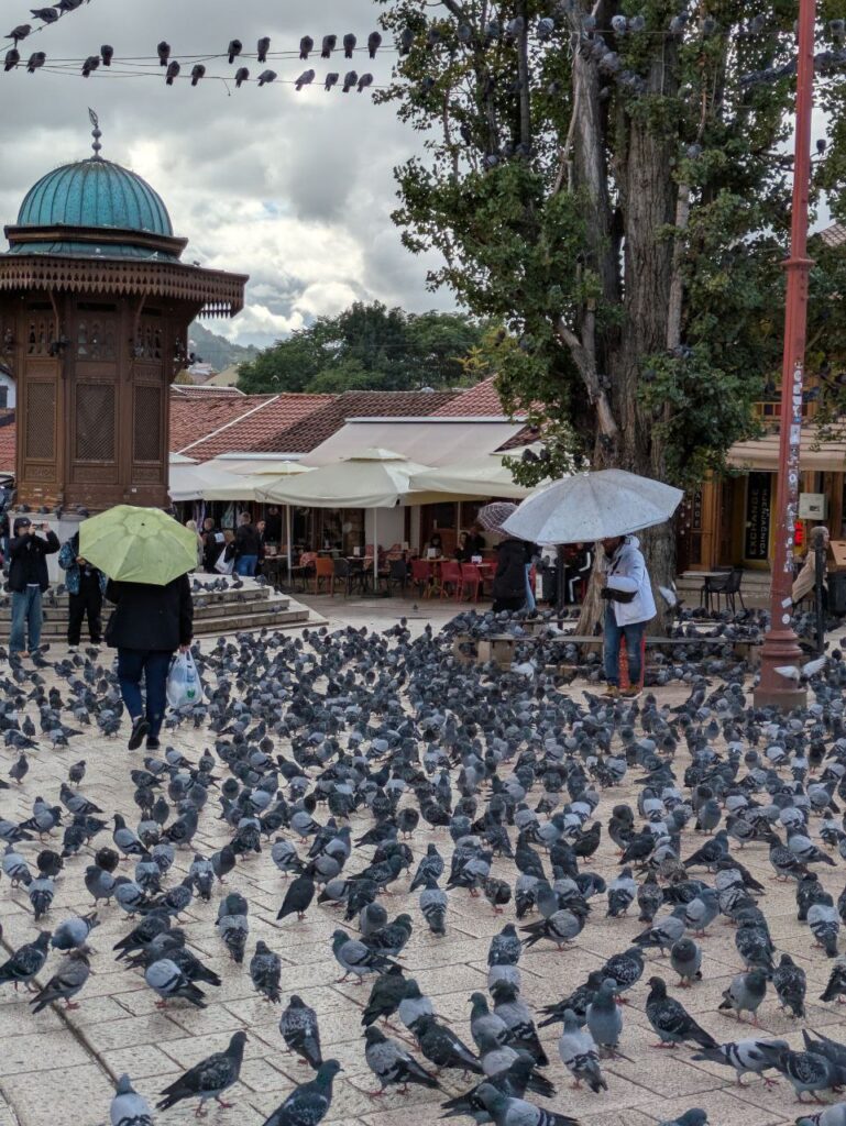 Auch am nächsten Tag zog es uns nochmal in die Altstadt. Von der gelben Bastion hatten wir bei gutem Wetter endlich einen tollen Blick über die Stadt. Zumindest in die eine Richtung gab es einen tollen Blick. In die andere Richtung sah man einen Haufen Sperrmüll… Im nächst besten Cafe gönnten wir uns noch einen bosnischen Kaffee – dazu gibt’s immer einen Gummibär-artigen Würfel, der nach Rosenparfum schmeckt. An einem schicken hölzernen Brunnen tummelten sich hunderte Tauben und erzeugten einen einzigartigen Anblick. Und endlich konnten wir die Altstadt mit ihren Moscheen und Märkten auch bei Tageslicht sehen. Auch eine altertümliche Markthalle hatte diesmal noch geöffnet. Wo früher wahrscheinlich teure Teppiche und Textilien gehandelt wurden, findet man heute alles was das Talahonherz höher schlagen lässt: von Gucci-Taschen über Rolex-Uhren bis hin zu dicken Sonnenbrillen. Wie viel davon echt ist sei mal dahingestellt. Was wir suchten, gab es allerdings nicht: schöne Postkarten… hier gibt’s wieder nur Postkarten mit ausgeblichenen Fotos und hässlichen Word-Arts aus den 90ern.