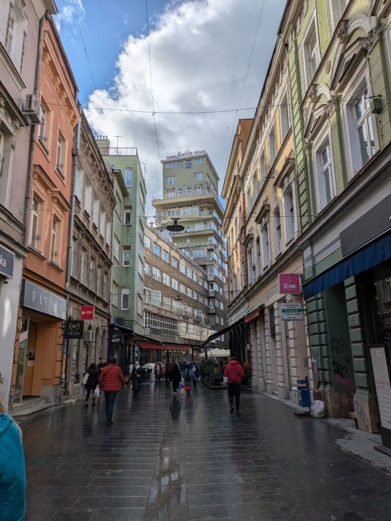 Der Regen hatte immer noch nicht nachgelassen, als wir uns vor dem erleuchteten Rathaus für die Stadtführung versammelten. Hier startete die Tour unserer Stadtführerin, der Frau unseres Gastgebers. Dass sie ein Talent dafür hatte bemerkten wir alle schnell: die Qualität der Führung war besser, als wir es selbst von professionellen Stadtführern kannten. Einmal quer durch die Altstadt ging unsere Tour, und damit auch die Geschichte Sarajevos. Da Sarajevo’s Altstadt in einem Talkessel lag, wuchs die Stadt sehr einseitig mit der Zeit. Bewegt man sich entlang dieser Achse, schreitet man Epoche für Epoche durch die Geschichte Sarajevos. Hier unterscheiden sich v.a. drei Teile voneinander: der osmanisch-türkische Teil bis ins 19. Jh., der neuere österreichische Teil, sowie der yugoslawische Teil aus dem 20. Jh. Von muslimischen Moscheen bis hin zu christlichen Kirchen und Fassaden, wie man sie aus Wien kennt.