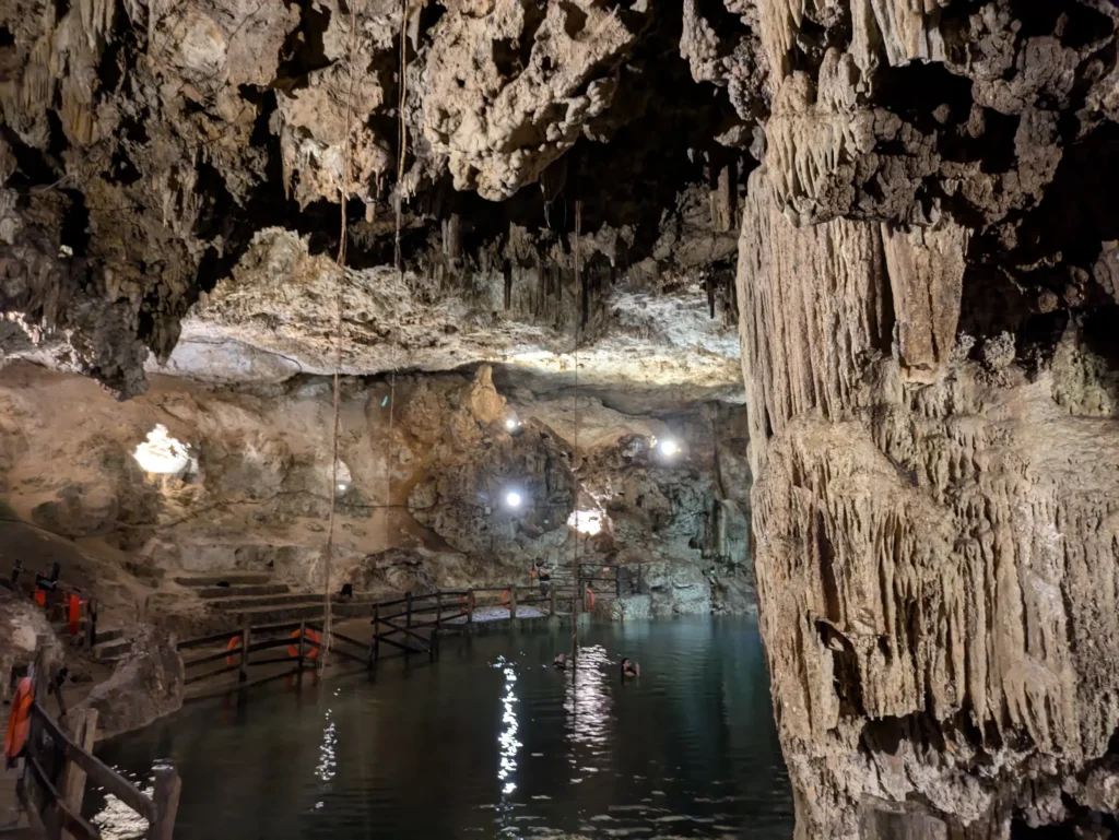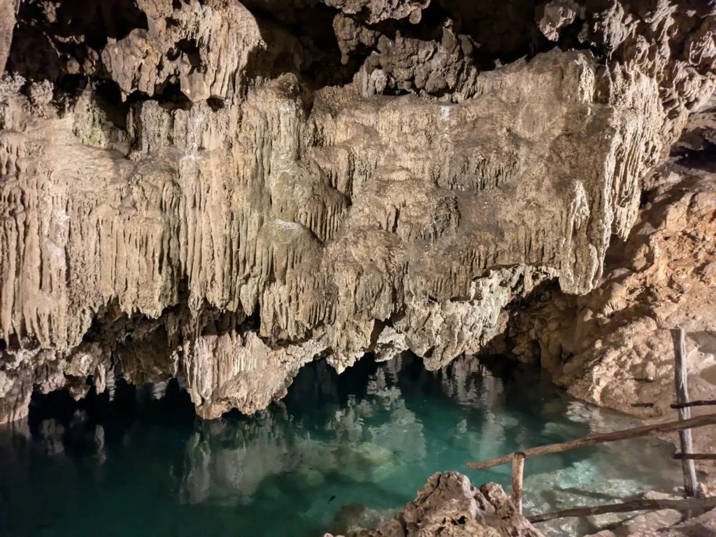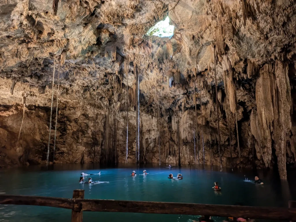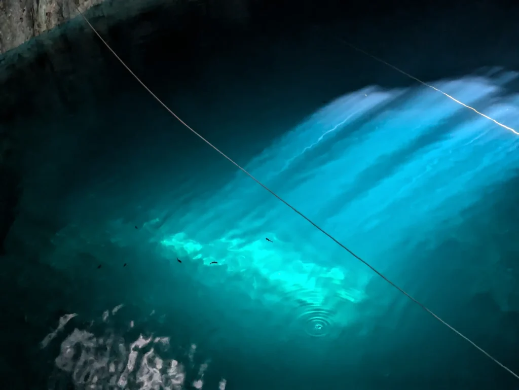 Die zweite Cenote selbst war übrigens genauso schön wie die erste. Die beiden ähneln sich sehr, da beide unterirdisch sind und Sonnenlicht durch einem Loch in der Decke auf das Wasser fällt.